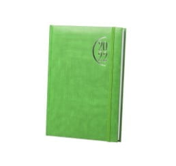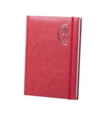 Agenda de tamaño A5 acabada en resistente y suave polipiel con acolchado, con elástico de sujeción a juego. De cubiertas rígidas, disponible en variada gama de colores