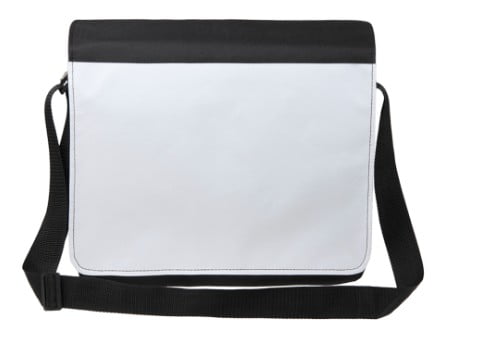 Bandolera con solapa de cierre de velcro en elegante poliéster 600D en combinación de colores negro y blanco especialmente diseñada para marcaje en sublimación.