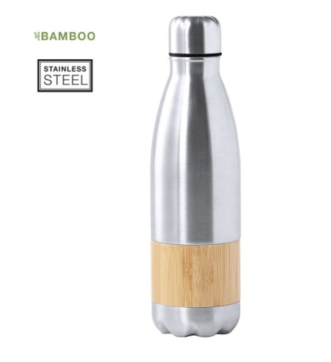 Bidón de línea nature, en combinación de materiales acero inox de acabado mate y bambú. 750ml de capacidad, con tapón de seguridad y presentado en atractiva caja de diseño eco