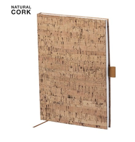 Bloc de notas de línea nature con tapas duras en corcho natural, de sobrio diseño. Incluye 100 hojas blancas lisas, con marcapáginas y soporte para bolígrafo a juego.