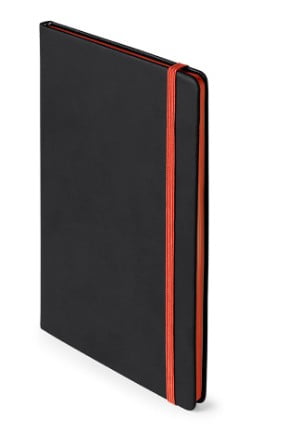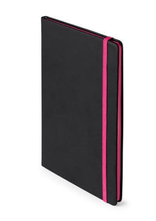 Bloc de notas con tapas de suave tacto acabadas en elegante polipiel negra. De 80 hojas lisas con lomo en divertidos colores, elástico de sujeción y marcapáginas de tela a juego.