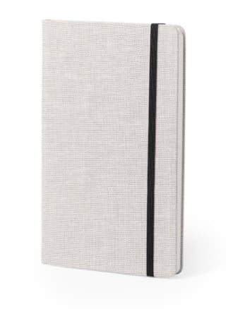 Bloc de notas con tapas rígidas de suave tacto acabadas en elegante combinación de poliéster bicolor. De 98 hojas lisas con lomo en divertidos colores, compartimento interior, elástico de sujeción y marcapáginas de tela a juego