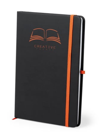 Bloc de notas con tapas de suave tacto acabadas en polipiel. En elegante color negro, con elástico de cierre, marcapáginas y soporte elástico para bolígrafo en vivos colores.