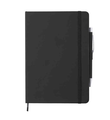 Set bloc de notas premium con bolígrafo. Tapas rígidas de suave tacto acabado polipiel y bolígrafo de aluminio en acabado goma a juego con carga jumbo. Incluye cierre elástico, marcapáginas y soporte para bolígrafo a juego. Interior con 100 hojas de disposición a 1 raya