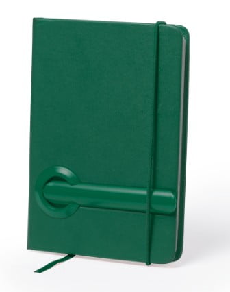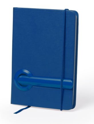 Bloc de notas con tapas rígidas de suave tacto acabadas en polipiel de vivos colores y con bolígrafo a juego integrado en portada. Con 80 hojas de distribución a una raya, elástico de sujeción y marcapáginas de tela a juego.