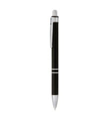 Bolígrafo de mecanismo pulsador en original diseño bicolor. Con cuerpo en aluminio de suave acabado en alegres colores. Accesorios y anillas en plateado. Clip de original diseño y tinta azul.