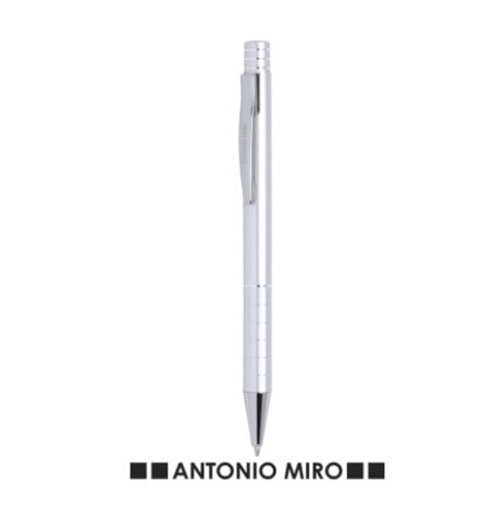 Bolígrafo de Antonio Miró de elegante diseño y suave cuerpo en aluminio con accesorios en color plateado.