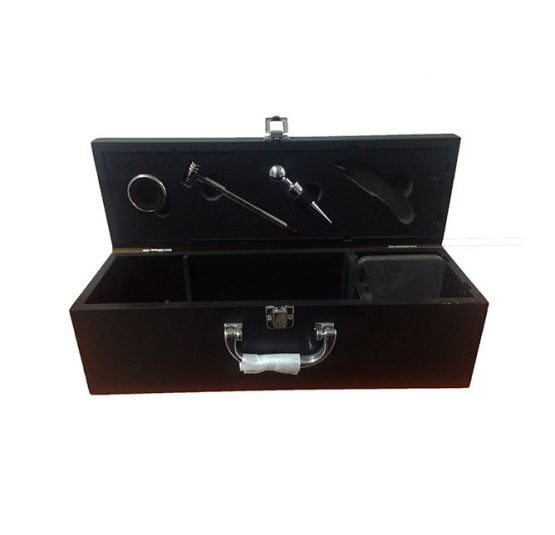 Caja porta vino con accesorios en la tapa cuerina negra con costuras en blanco