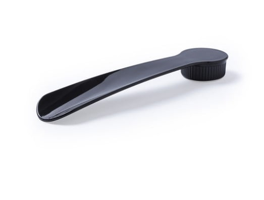 Calzador 2 en 1 en sobrios colores. Con esponja limpiadora de zapatos integrada y tapón con cierre de rosca.