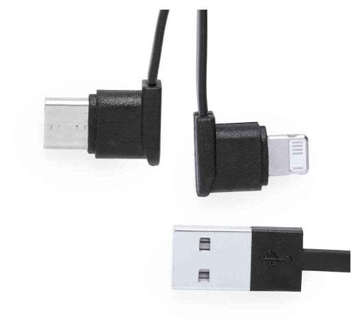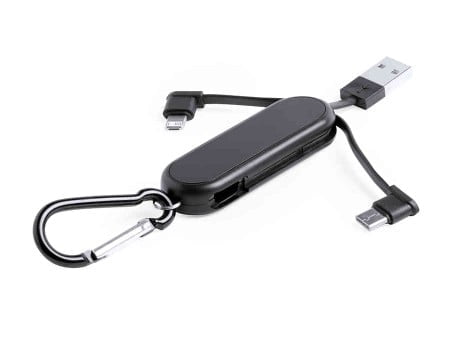 Cargador con mosquetón de aluminio y cuerpo en plástico ABS, de tamaño compacto y portable. Con mosquetón a juego de transporte, conexiones micro USB, Tipo C y Lightning. En elegante color negro, con luz led interior y un recubrimiento exterior especialmente diseñado para marcaje en láser