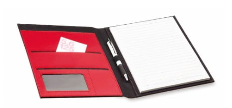 Carpeta en vivos colores acabada en suave polipiel, con chapa metálica exterior especialmente diseñada para marcaje a láser. Interior a juego con bloc extraíble de 20 hojas de distribución a una raya, 4 bolsillos y soporte para bolígrafo.