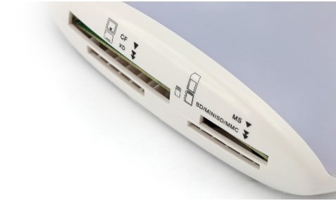 Original lector de tarjetas con original diseño curvado bicolor y tapa superior translúcida retroiluminada. Con rotulador para escribir mensajes en la parte retroiluminada y compatible con tarjetas SD, MiniSD,mmC, XD, XS, CF.