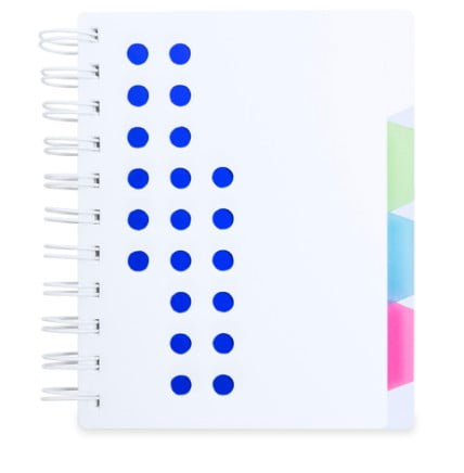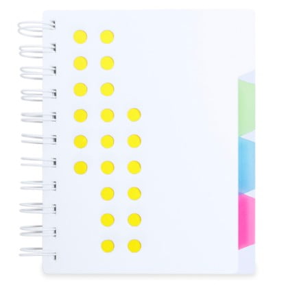Original libreta de anillas de diseño bicolor y tapas agujereadas de suave acabado. De 116 hojas con distribución a una raya con encabezado -Date-/-Nº- y separadores de interiores