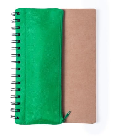 Libreta de anillas con tapas de suave tacto acabadas en resistente cartón reciclado. Con estuche en poliéster 600D de vivos colores y cierre de cremallera integrado en portada. Incluye bolígrafo en cartón reciclado y set de regla, lápices y sacapuntas en madera natural. 70 hojas lisas