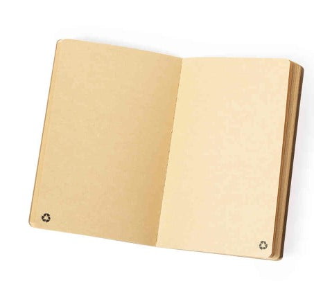 Libreta A5 de línea nature, con tapas blandas en resistente cartón reciclado. 60 hojas lisas de acabado kraft y distintivo reciclado.