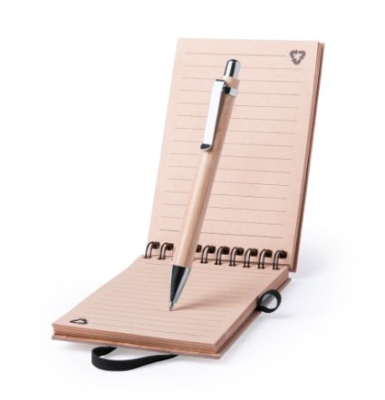 Libreta de anillas en línea nature con tapas rígidas de bambú y bolígrafo a juego, también en bambú. De tamaño compacto, con elástico de cierre en elegante color negro. Incluye 70 hojas con disposición a una raya y diseño eco. Bolígrafo con cartucho jumbo y tinta azul.