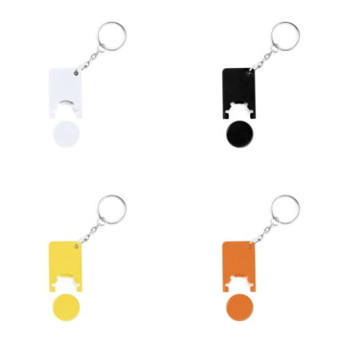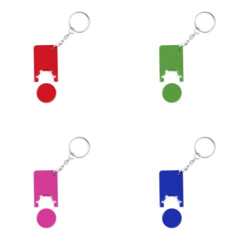 Llavero moneda en divertido diseño de variados colores y con moneda extraíble.