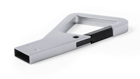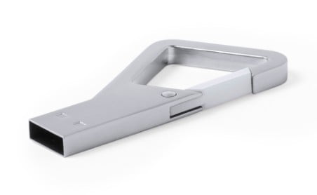 Memoria USB de 8GB de capacidad de acabado metálico y con original diseño de mosquetón con cierre en variada gama de colores. Presentada en estuche metálico individual con ventana e interior troquelado en suave espuma