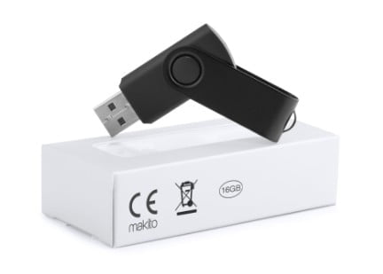 Memoria USB de 16GB de capacidad, con mecanismo giratorio, cuerpo de suave acabado y clip metálico a juego en acabado brillante. Presentada en estuche individual.