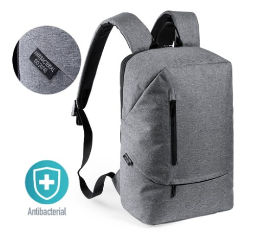 Mochila antibacteriana en resistente poliéster 600D. Con cierre de cremallera de doble tirador y bolsillos en frontal, incluye accesorio para anclaje en trolley. Interior con bolsillo acolchado para ordenador portátil de hasta 15 pulgadas.