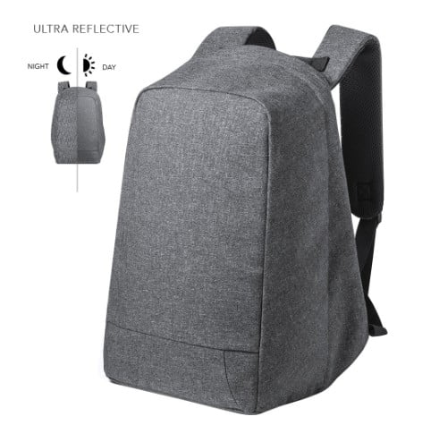 Mochila antirrobo reflectante de alta visibilidad, elaborada en resistente poliéster 600D de calidad premium y acabado en color gris.