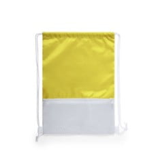Mochila de cuerdas en suave poliéster 210D de original diseño bicolor. Con bolsillo frontal de redecilla con cierre de cremallera en color blanco. Cuerdas autocierre en color blanco y esquinas reforzadas.