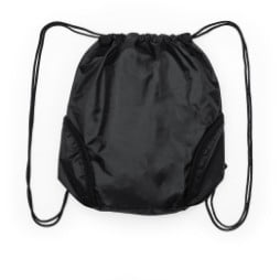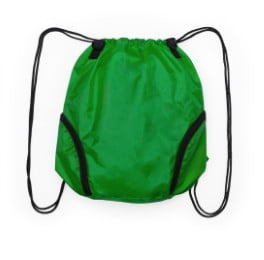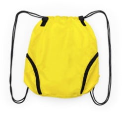 Versátil mochila de cuerdas en poliéster 210D en atractivo diseño bicolor. Con 3 bolsillos exteriores de cremallera y accesorio en cierre para acople de asa de transporte con cierres de mosquetón.