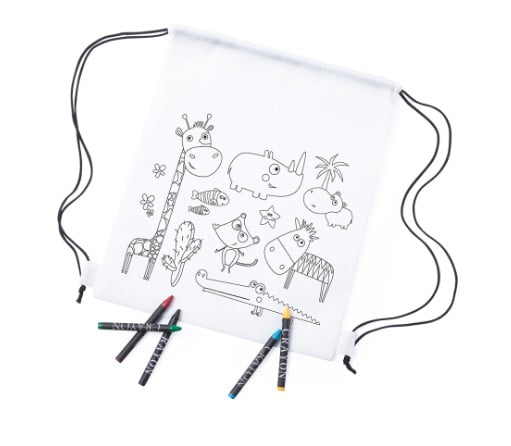 Mochila de non-woven en color blanco especialmente diseñada para colorear con ceras. Incluye 5 ceras de cuerpo cilíndrico en variados colores. Con cuerdas autocierre en color negro y refuerzo en las esquinas.
