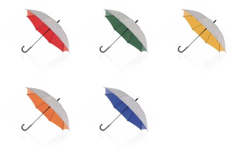 Paraguas de 8 paneles en original combinación de parte exterior en color plateado e interior en variada gama de vivos colores. De 102cm de diámetro, con apertura automática y en resistente material poliéster.