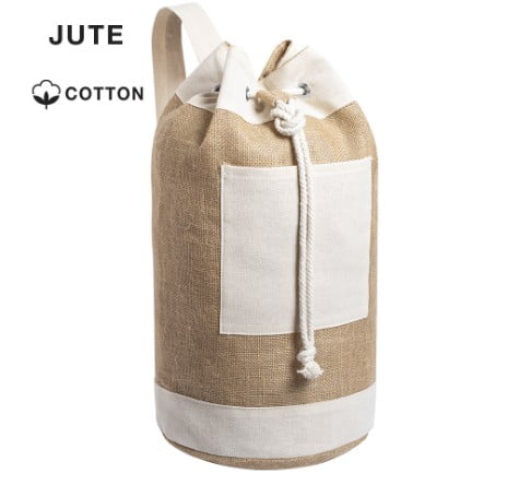 Petate multiusos de línea nature y diseño bicolor. Fabricado en yute, con detalles en algodón. Con cinta ajustable y bolsillo interior. Compartimento principal con argollas metálicas reforzadas y bolsillo frontal para fácil marcaje.