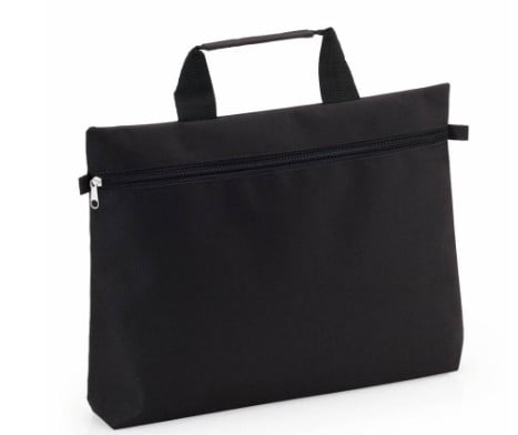 Portadocumentos de cierre de cremallera en suave acabado de poliéster 600D de vivos colores. Con asas de transporte con refuerzo a juego, cremallera y soportes laterales a juego.