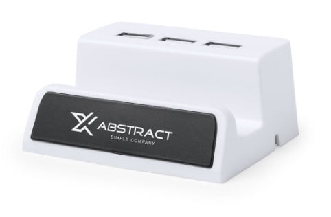 Puerto USB en diseño minimalista de color blanco con soporte para smartphone integrado y 3 salidas USB 2.0. Área de marcaje superior especialmente diseñada para grabación en láser y así conseguir que tu publicidad o marca quede originalmente iluminada con luz blanca.