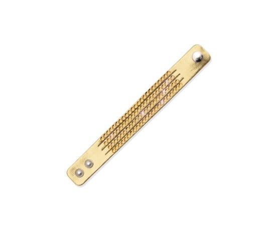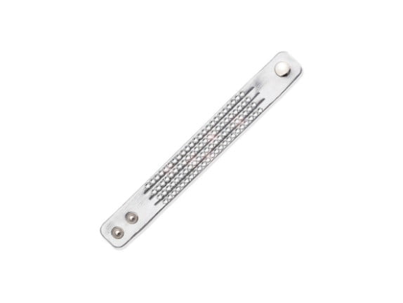 Elegante pulsera de polipiel con incrustaciones brillantea de vivos colores. Con cierre de corchete ajustable.