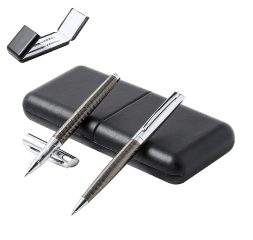 Set premium de bolígrafo y roller. Fabricado en elegante combinación de metal en tonos negros y cromados. Bolígrafo de mecanismo giratorio en tinta azul y con cartucho jumbo. Roller con capucha y tinta gel en azul, carga jumbo.