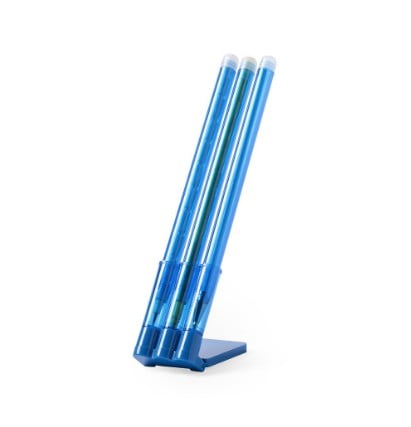Original set de bolígrafo, marcador y lápiz con puntas intercambiables. De cuerpo en suave acabado de vivos colores translúcidos y presentado en funda soporte individual a juego. Bolígrafo de tinta azul, marcador fluorescente amarillo y lápiz de mina negra.