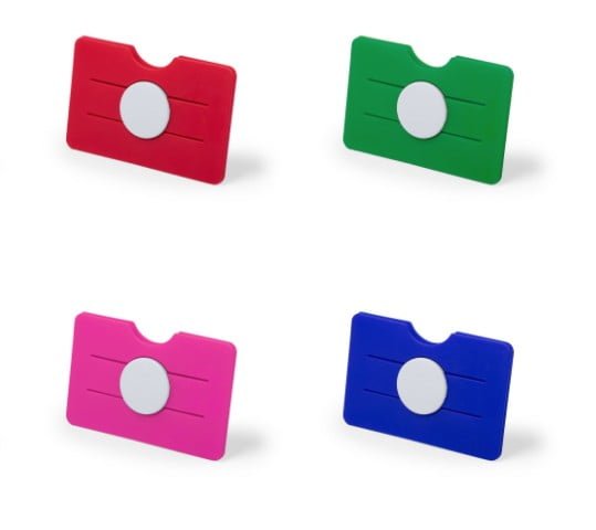 Tarjetero con sporte para smartphone. En materiales ABS y silicona, con adhesivo 3M, de fijación extra fuerte y libre de residuos al despegarlo del dispositivo.