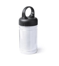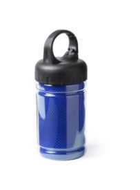 Toalla de 90x30cm en material refrigerante SoftCool Extreme con protección UV50. De 160g/m2 y presentada en estuche individual transparente con asa mosquetón de transporte integrada en tapa.