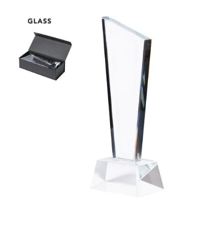 Trofeo de grueso cristal con original diseño y resistente base. Especialmente diseñado para marcaje a láser y presentado en estuche de protección en resistente cartón y cierre magnético, con interior troquelado en espuma.